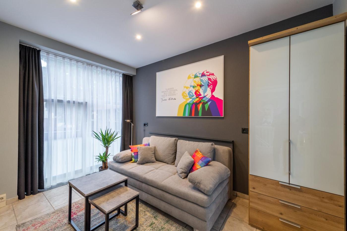 Studio Apartment. The studio offers a sofa, a tiled floor, as well as a private bathroom boasting a shower and a hairdryer. Guests can make meals in the kitchenette that has a stovetop, a refrigerator, kitchenware and a toaster. The studio features a flat-screen TV with satellite channels, a tea and coffee maker, a dining area, a wardrobe as well as a quiet street view. The unit has 2 beds. ;